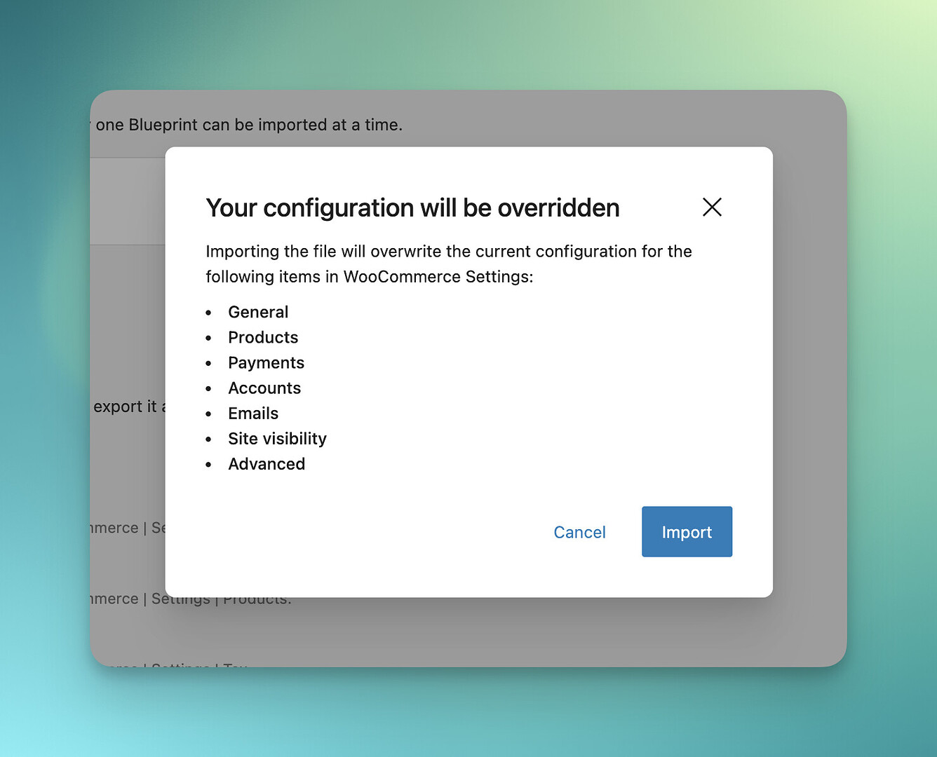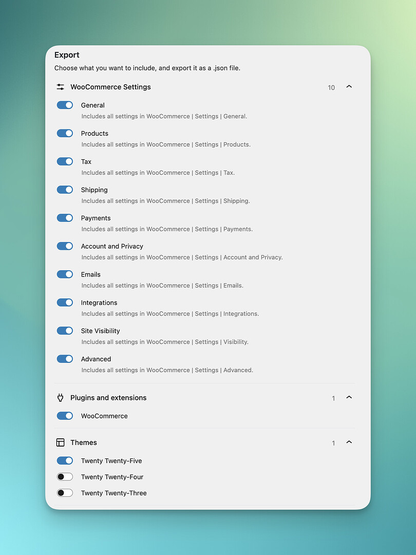 您可以将蓝图视为可导出的配置快照(便携式JSON文件),导入任何WordPress安装即可复现完全相同的WooCommerce设置。