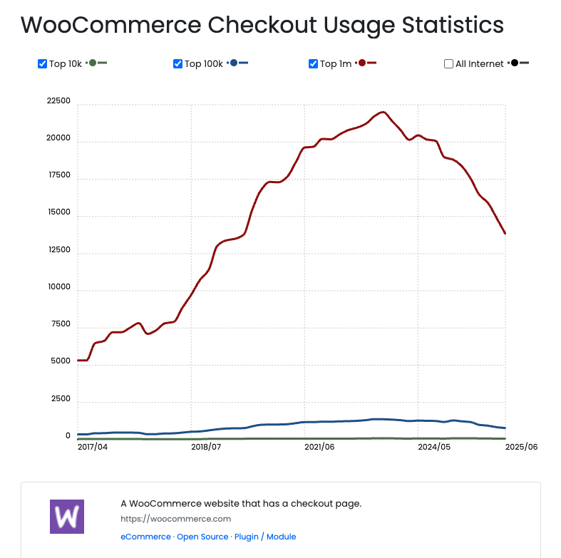 也恰好是在同一时期 WooCommerce 的增长也没好到哪去,2022 年底到达顶峰后开始回落增长放缓。